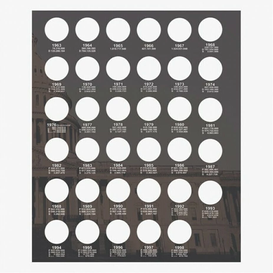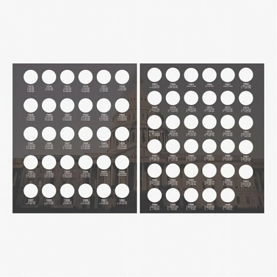 Nesse álbum você encontra os espaços para guardar e organizar todas as moedas de 25 centavos de dollar, Washington, desde 1932 ate 1998, uma moeda de cada data.
