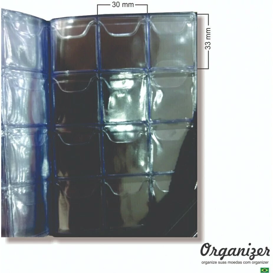 Álbum para 120 moedas protege contra o desgaste da moeda, sendo por manuseio ou ação natural do tempo. Servem para separar as moedas em 12 divisórias por folha, sendo que, em cada uma delas possui uma pequena aba protetora evitando a queda.
