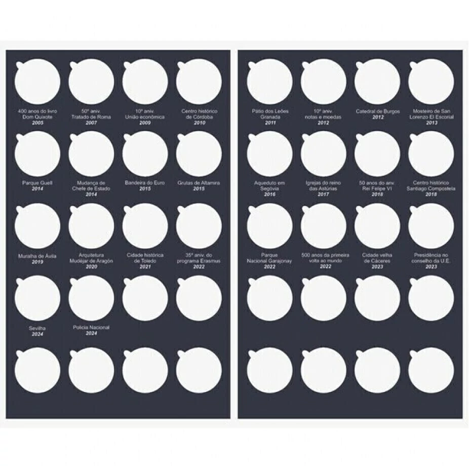 Contem espaços para 40 moedas de 2 euros com encaixe perfeito. Podendo organizar e guardar as suas moedas do ano de 2004 ate os dias de hoje.