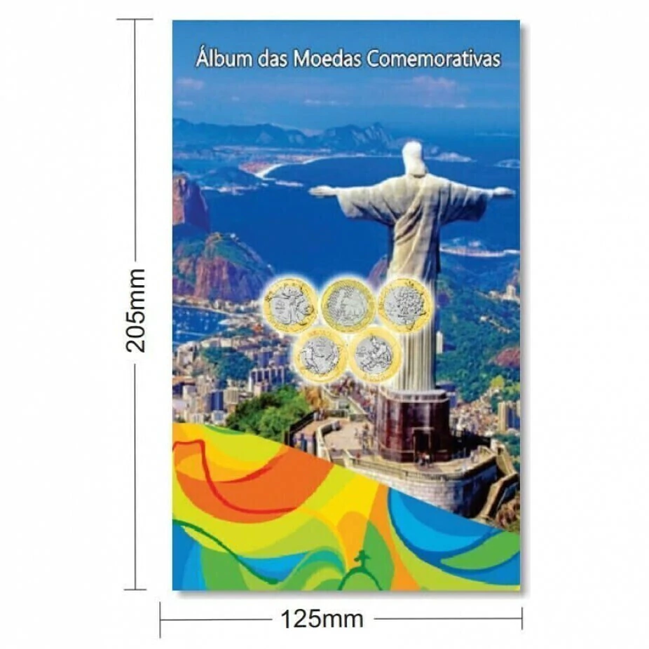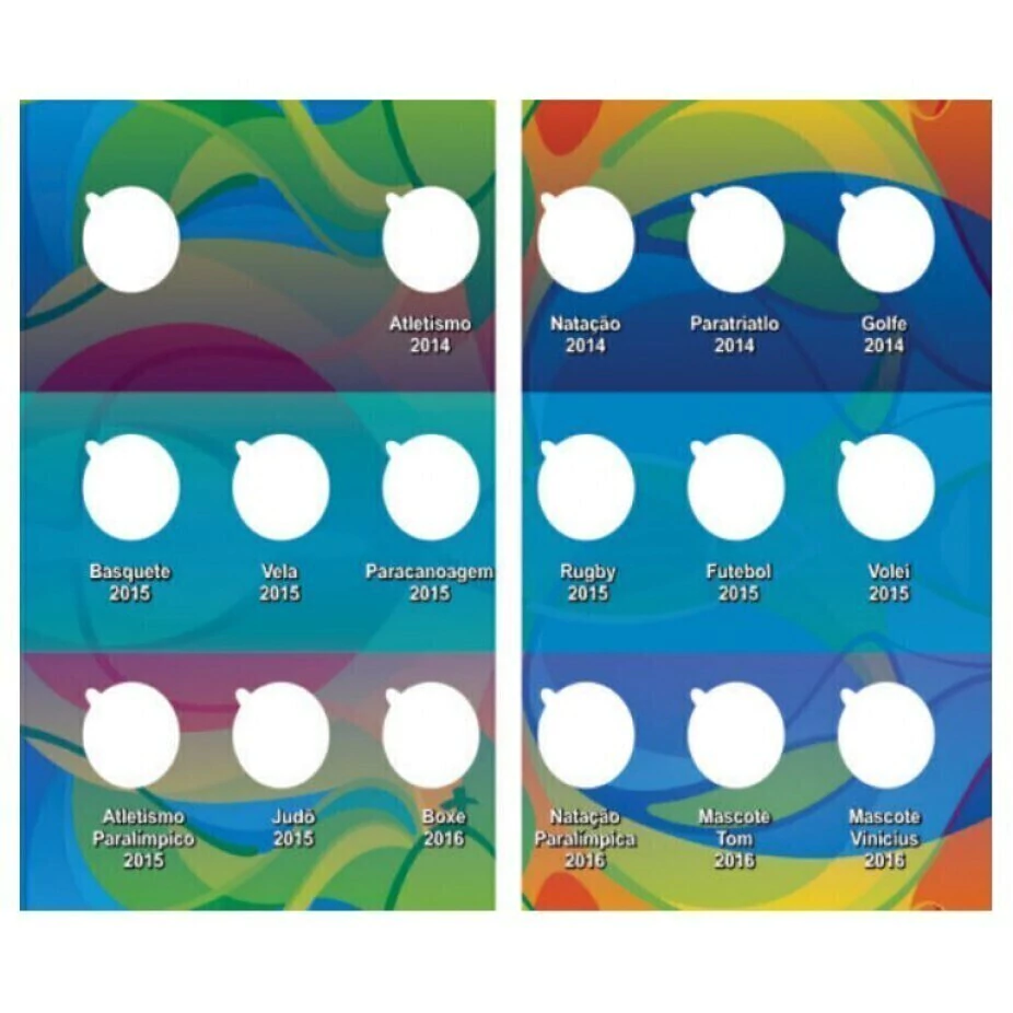 Álbum para moedas das Olimpíadas Rio 2016, compacto. Possui espaço para as moedas alusivas as olimpíadas e paralimpíadas. São 2 mascotes, 14 modalidades e 1 espaço extra para colocar a moeda da entrega da bandeira olimpica ou o anverso da moeda.