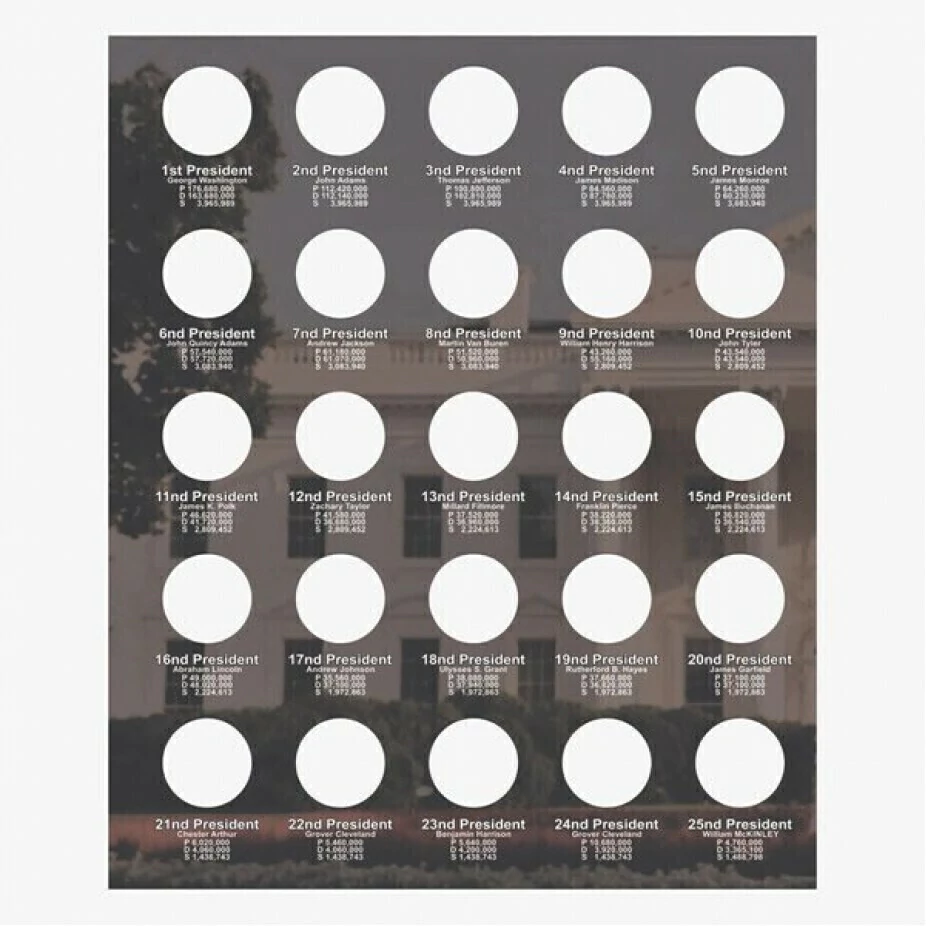 Nesse álbum você encontra os espaços para guardar e organizar todas as moedas de 1 dollar da serie Presidentes Americanos, uma moeda de cada presidente.
