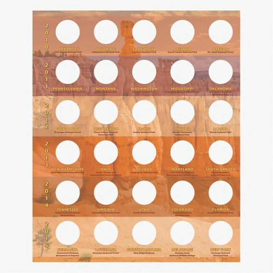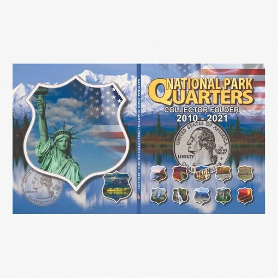 Nesses álbuns você encontra os espaços para guardar e organizar todas as moedas de 25 centavos de dollar da serie Parks Americanos, 2010 ate 2021, uma moeda de cada parque.