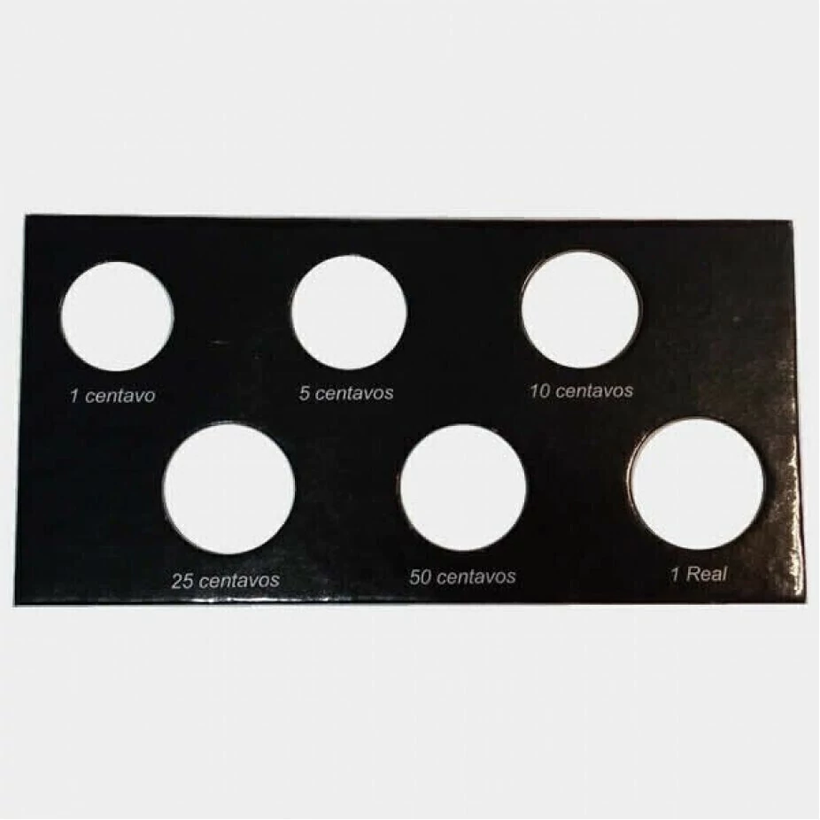Produzida em papelão, comporta 6 moedas de 1, 5, 10, 25, 50 centavos e 1 Real